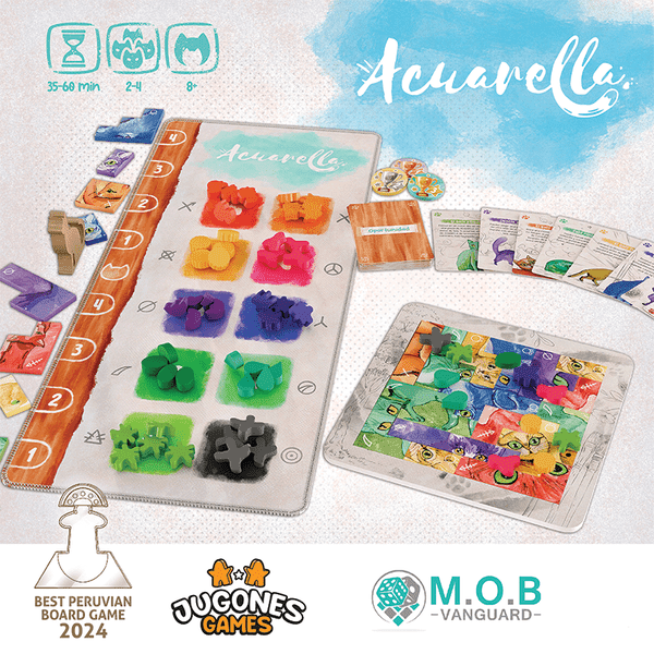 Acuarella es un juego competitivo de colocación de poliominós donde crearás tu propia obra de arte con adorables ilustraciones de gatos 🎨🐱