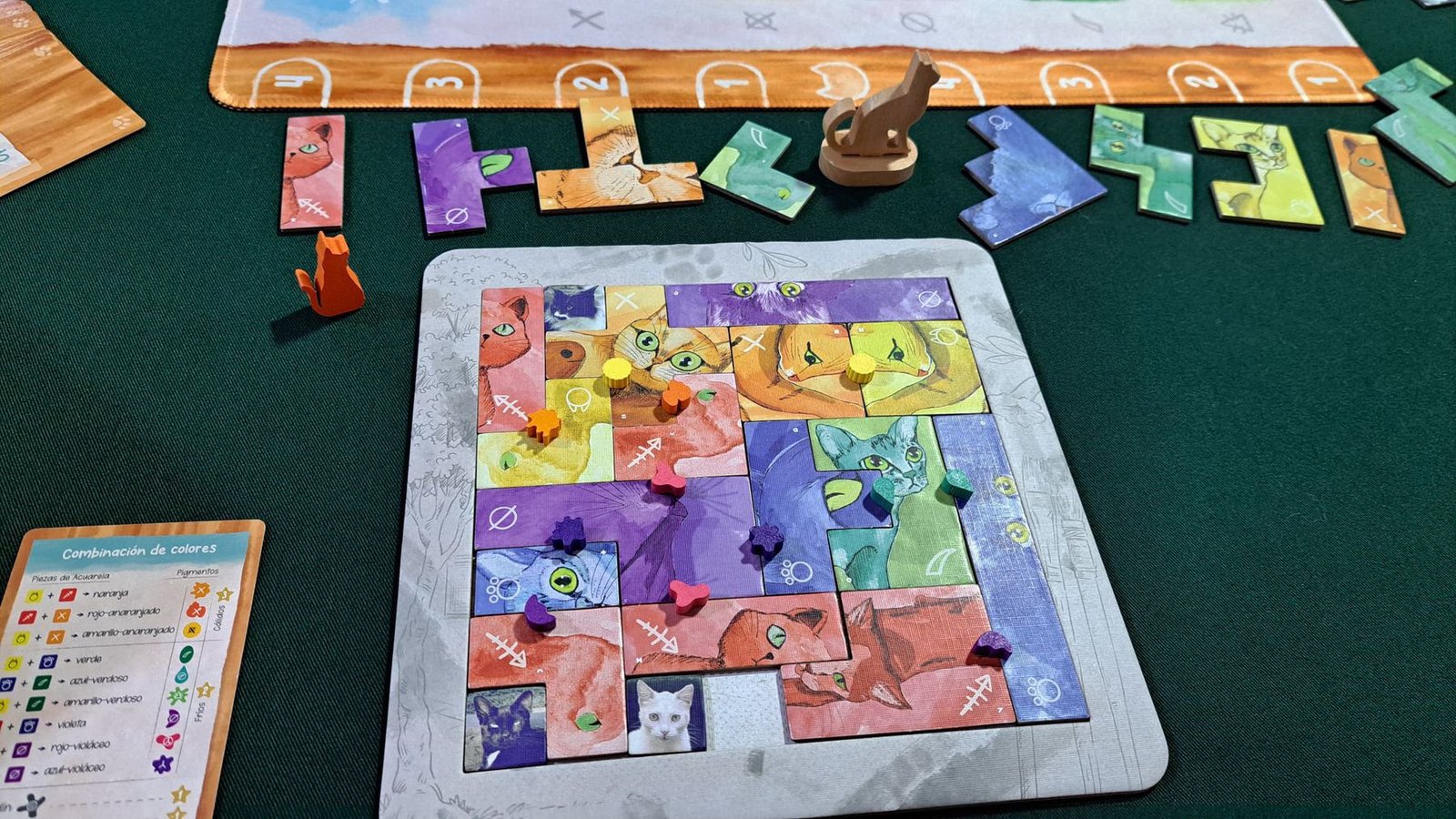 Para lograrlo, combinarás tus fichas de gato en tu lienzo personal, mezclando colores para obtener nuevos pigmentos que te darán ventaja.